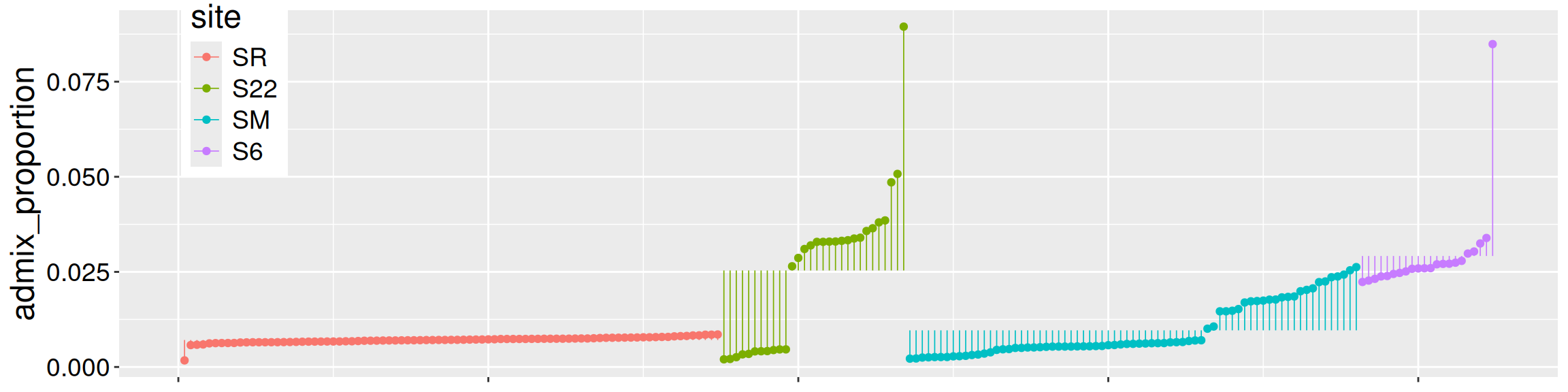 We cast this as a linear model as follows: \(\widehat{\text{admix prop}}_i = 0.0071 + 0.0183 \times \text{S22}_{i} + 0.0025 \times \text{SM}_{i} + 0.0221 \times \text{S6}_{i}\).