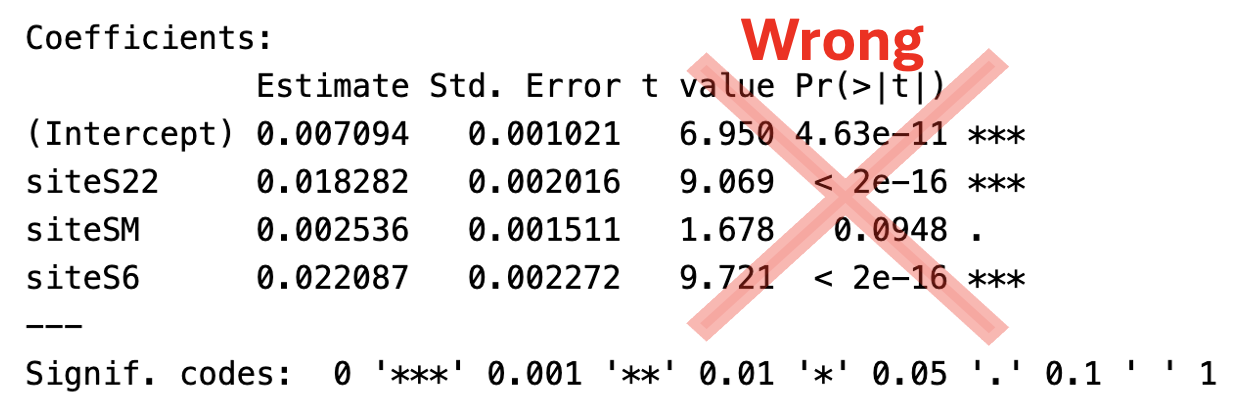 (Intercept)row, these relate to the null hypothesis that this value equals zero. In our case this is clearly stupid – the admixture proportion cannot be negative, so any nonzero value means we know the mean is not zero.The t- and p-values test whether each category differs from the reference level. While these hypotheses may be interesting, these summaries should still be ignored because: