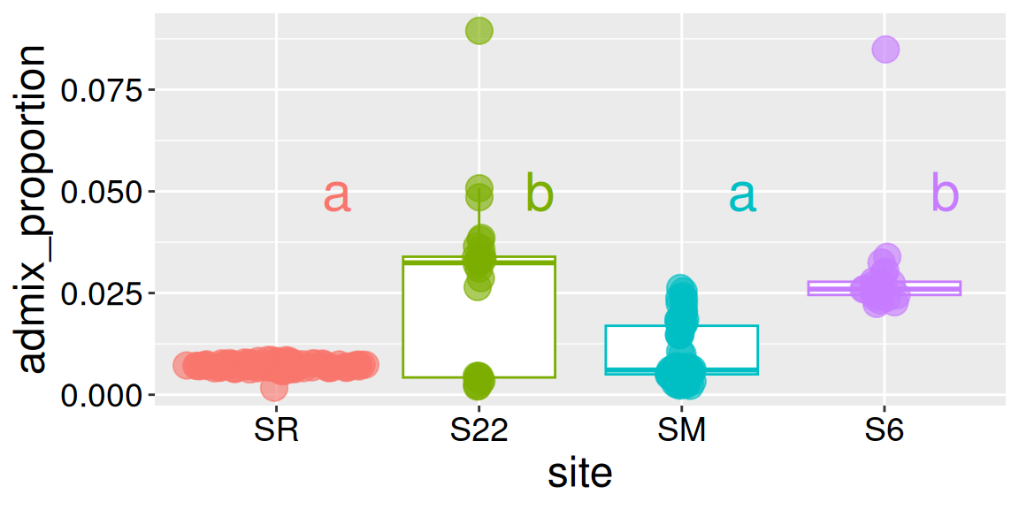 library(multcomp)lm(admix_proportion ~ site, data = clarkia_hz)|>glht(linfct =mcp(site ="Tukey"))|>cld()