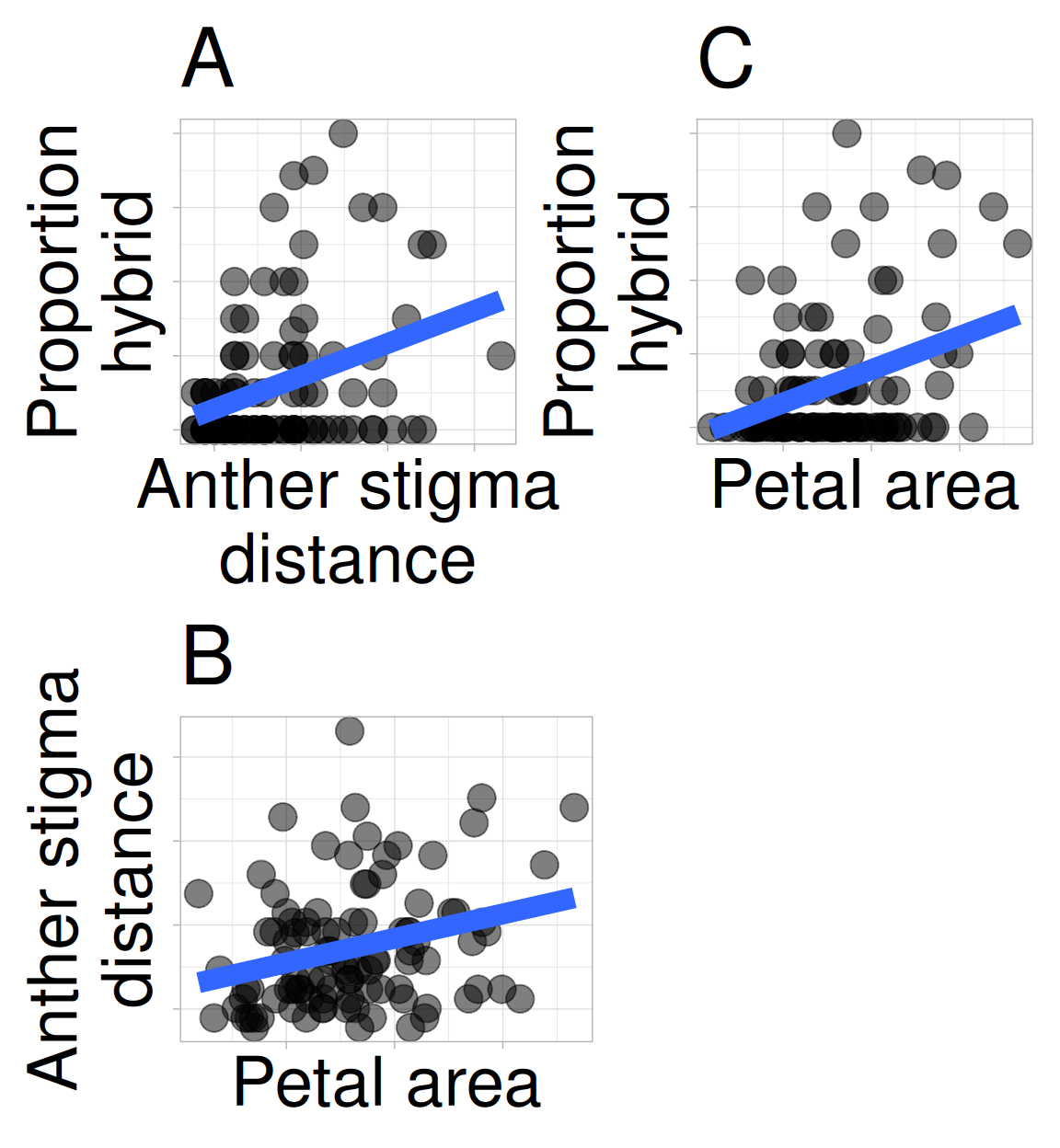 - Confounding: An association between two variables may reflect not a causal connection between them – but rather the fact that both are caused by a third variable (known as a confound). Such confounding may be at play in our RIL data – we observe that anther–stigma distance is associated with the proportion hybrid seed, but anther–stigma distance is also associated petal area (presumably because both are caused by flower growth), which itself is associated with the proportion of hybrids (Figure 3). So, does petal area or anther stigma distance (or both or neither) cause an increase in proportion of hybrid seed? The answer awaits better data, or at least better analyses (see section on causal inference), but I suspect that petal area, not anther stigma distance “causes” proportion hybrid. Unfortunately, we rarely know the confound, let alone its value. So, interpreting any association as causation requires exceptional caution.