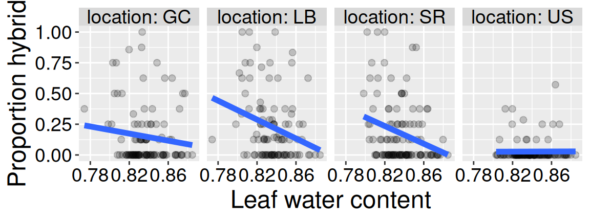 We again see such a case in our RIL data - leaf water content reliably predicts the proportion of hybrid seed set at three experimental locations, but is completely unrelated to proportion of hybrid seed at Upper Sawmill Road (location: US, Figure 3).