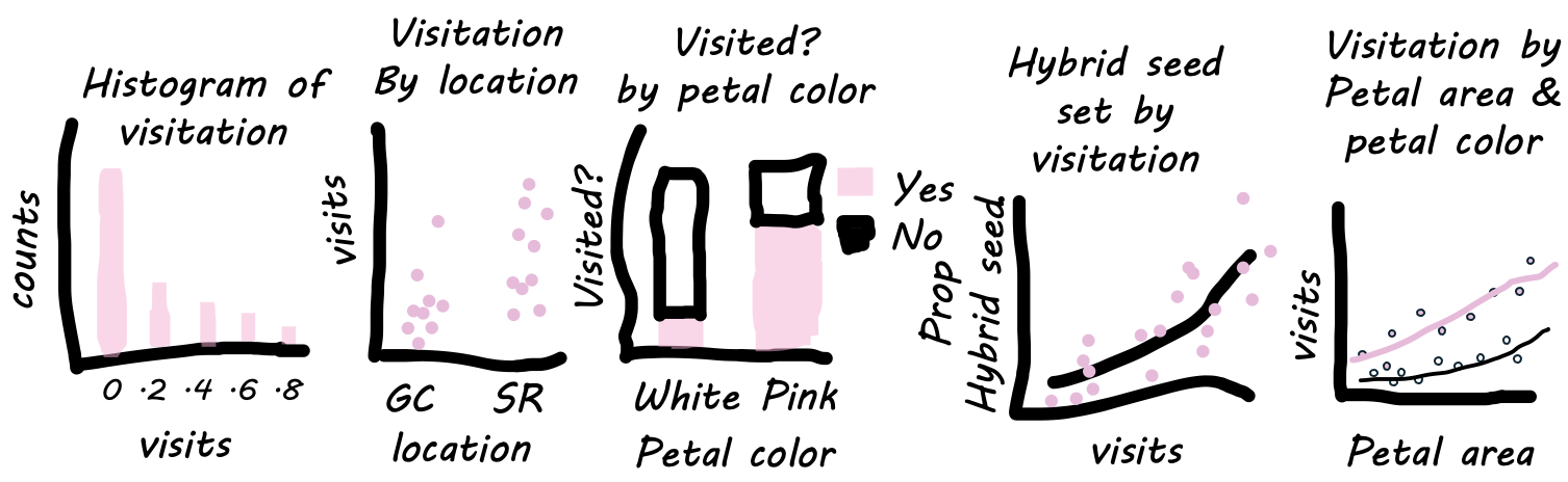 - Our response variables are hybrid seed production and pollinator visitation (and perhaps we would like to know the extent to which pollinator visitation predicts the proportion of hybrid seed).