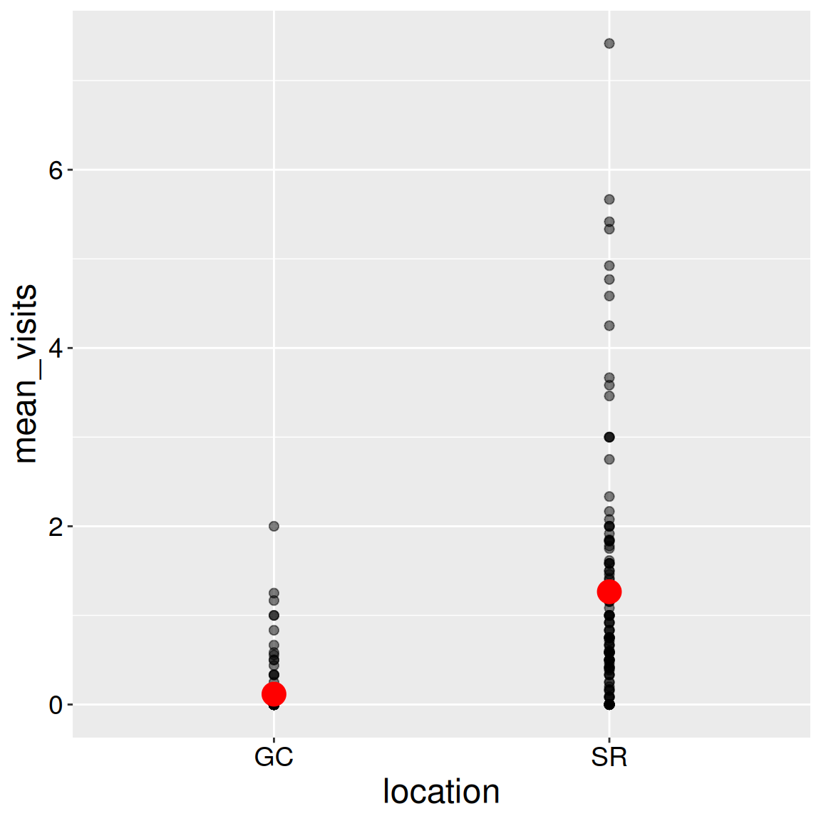 ggplot(aes(x = location, y = mean_visits))Continuous response to a categorical explanatory variable: A Step-by-Step Guide: In the tabs below I show some options for our geom.