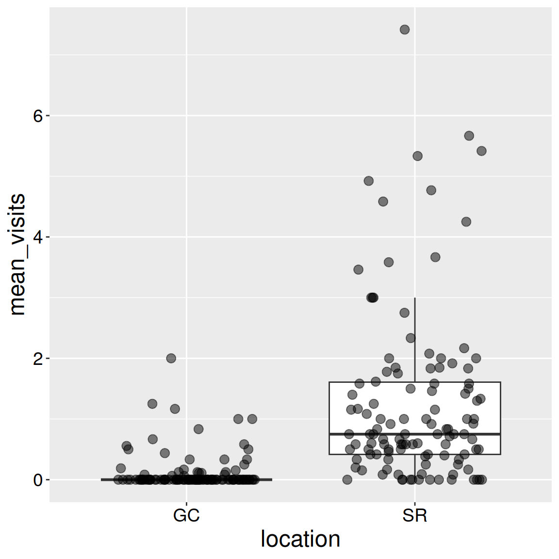 Interpretation: Returning to our motivating question, we see that plants at the SR population receive way more visits by pollinators than do plants at GC.