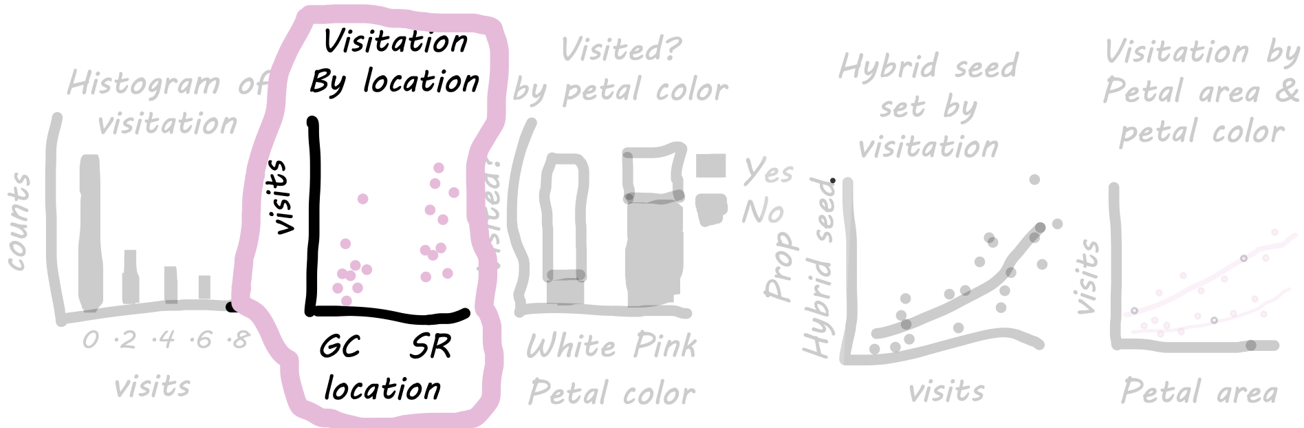 - Filter our data for samples from "GC" and "SR" (because we did not conduct pollinator observations at the other sites). We have not yet learned this so I make this reduced data set, called