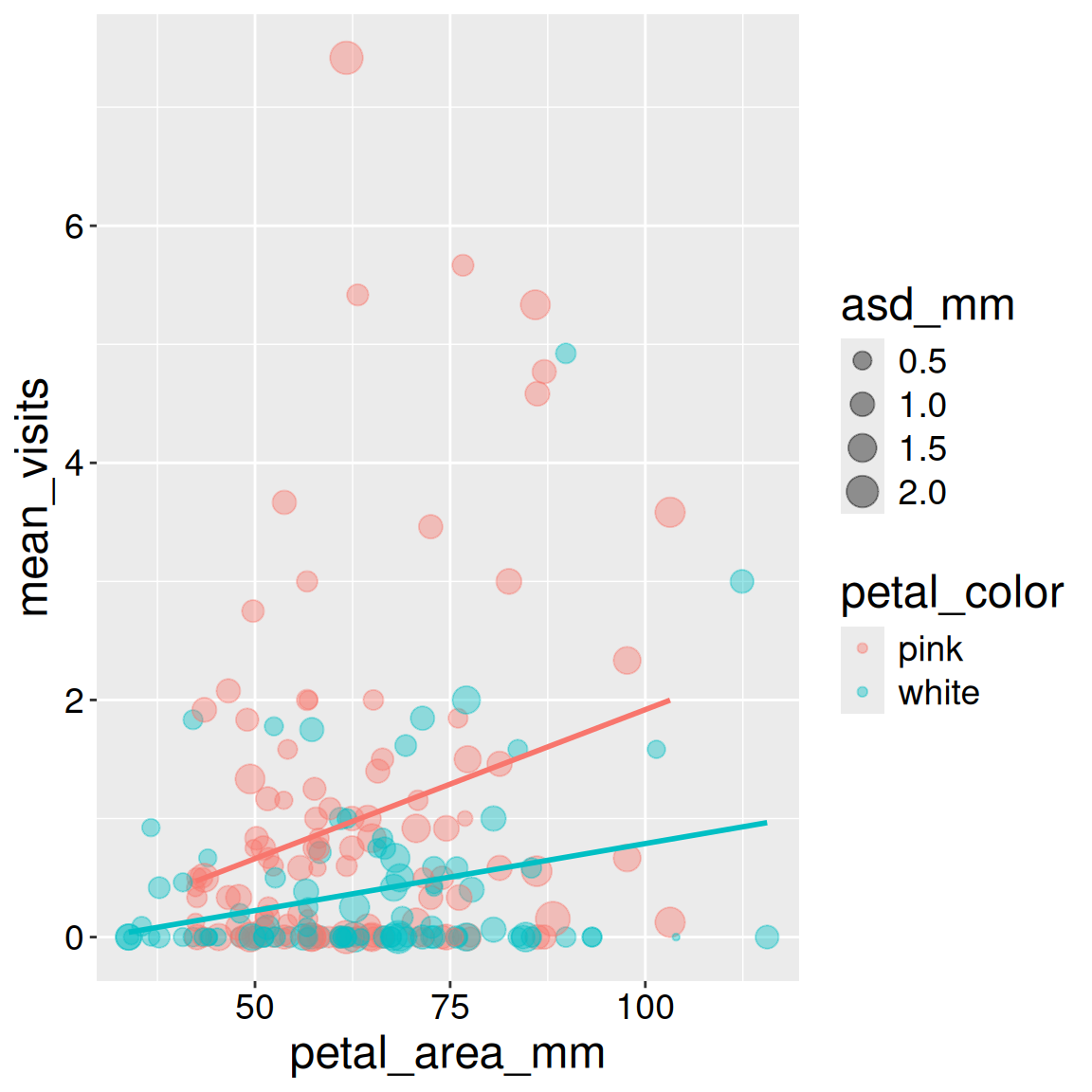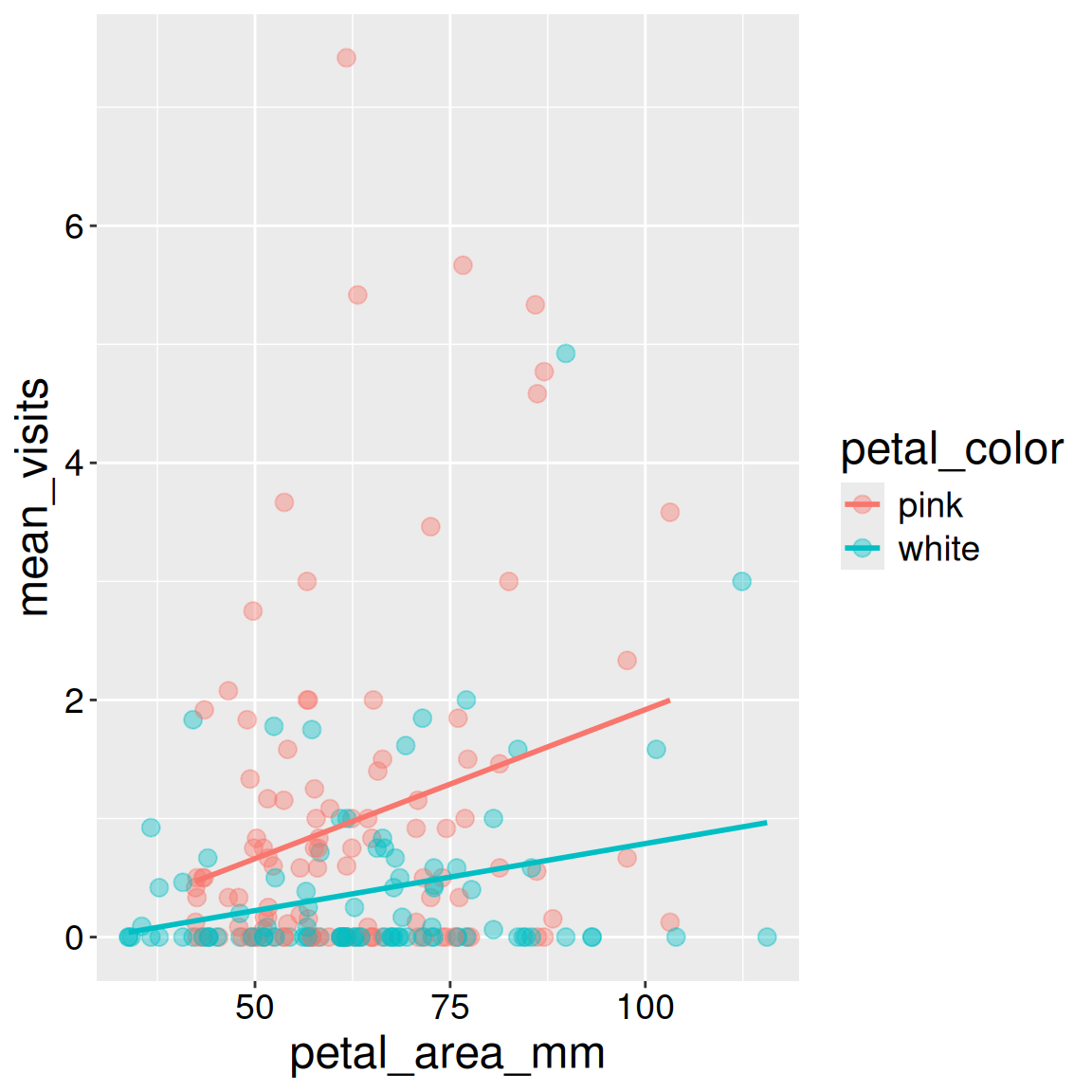 We saw that the number of pollinators increased with petal size and was greater for pink than white flowers. However, visualizing a response variable as a function of its multiple explanatory variables together can help us home in on the patterns.