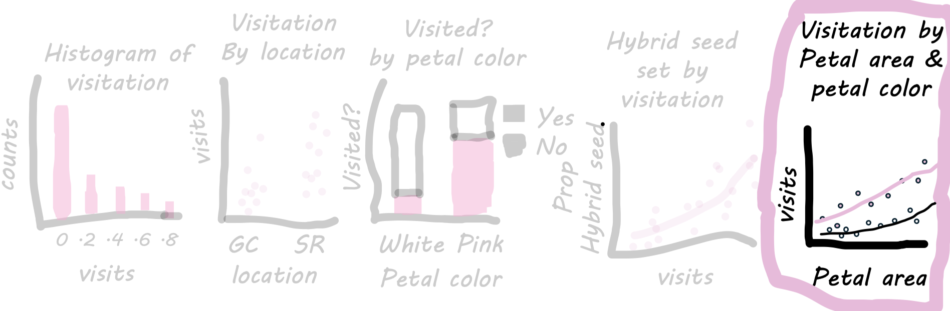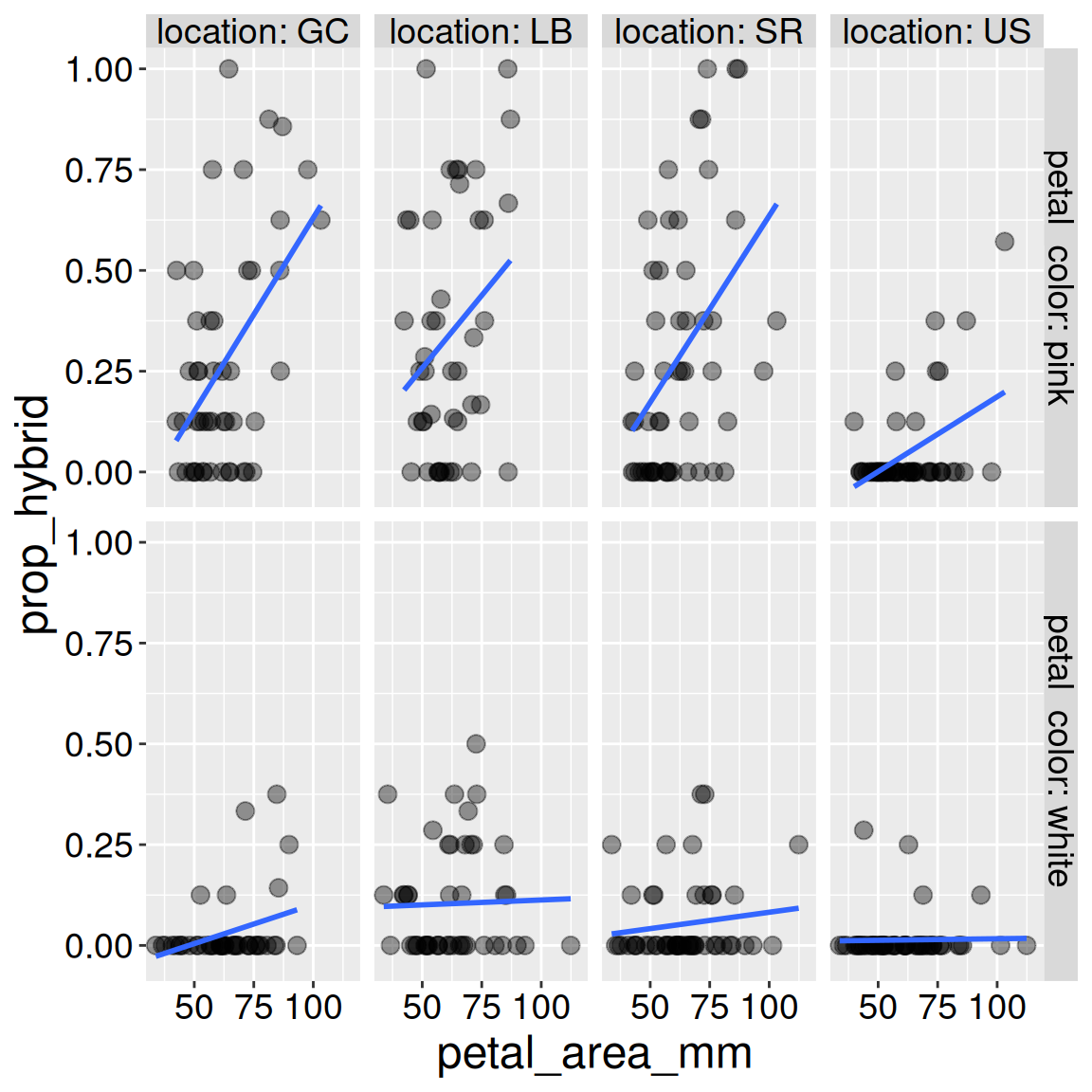 Interpretation: Returning to the motivating question, we see that visitation increases with both petal area (positive slope) and pink petals. The proportion of seeds that are hybrids appears to increase with pollinator visitation. Later in the term we will address this question more rigorously.