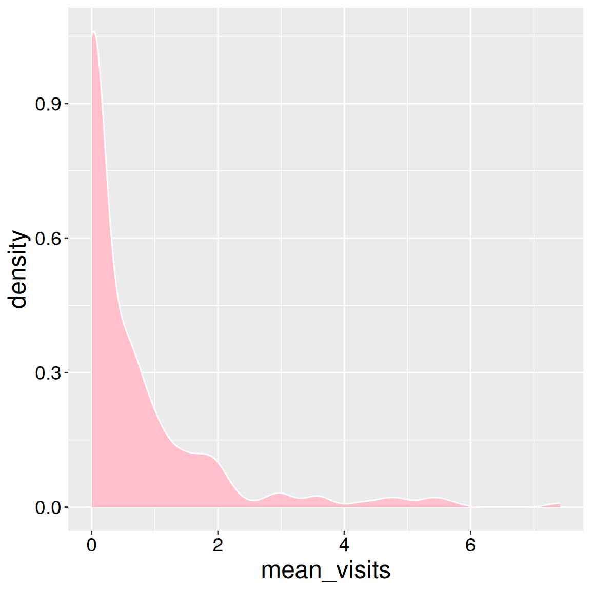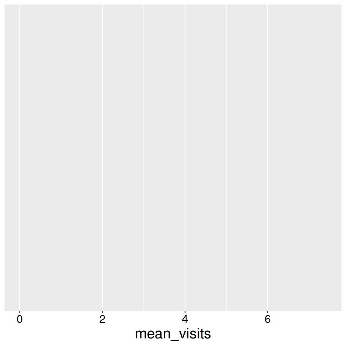 Inside the ggplot() function, we tell R that we are working with the ril_data, and we map mean_visits onto x inside aes(). The result is a boring canvas, but it is the canvas we build on.