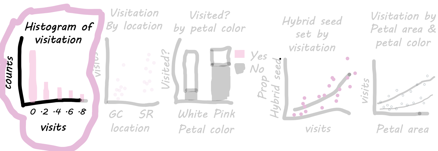 Let’s first consider the distribution of a single continuous variable—pollinator visitation. There are some natural questions we would want answered early on in our analysis: