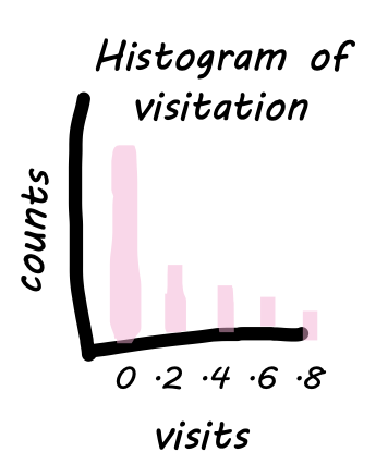 - A histogram bins the x-axis variable (in this case, visitation) into intervals and shows the number of observations in each bin on the y-axis. This allows us to see how frequently different levels of visitation occur.