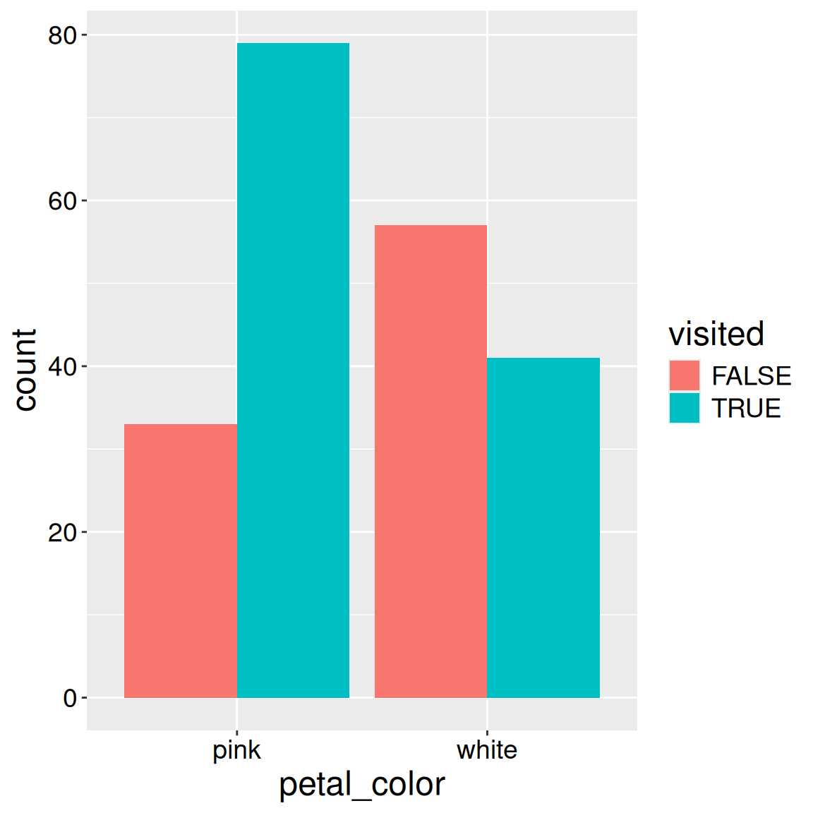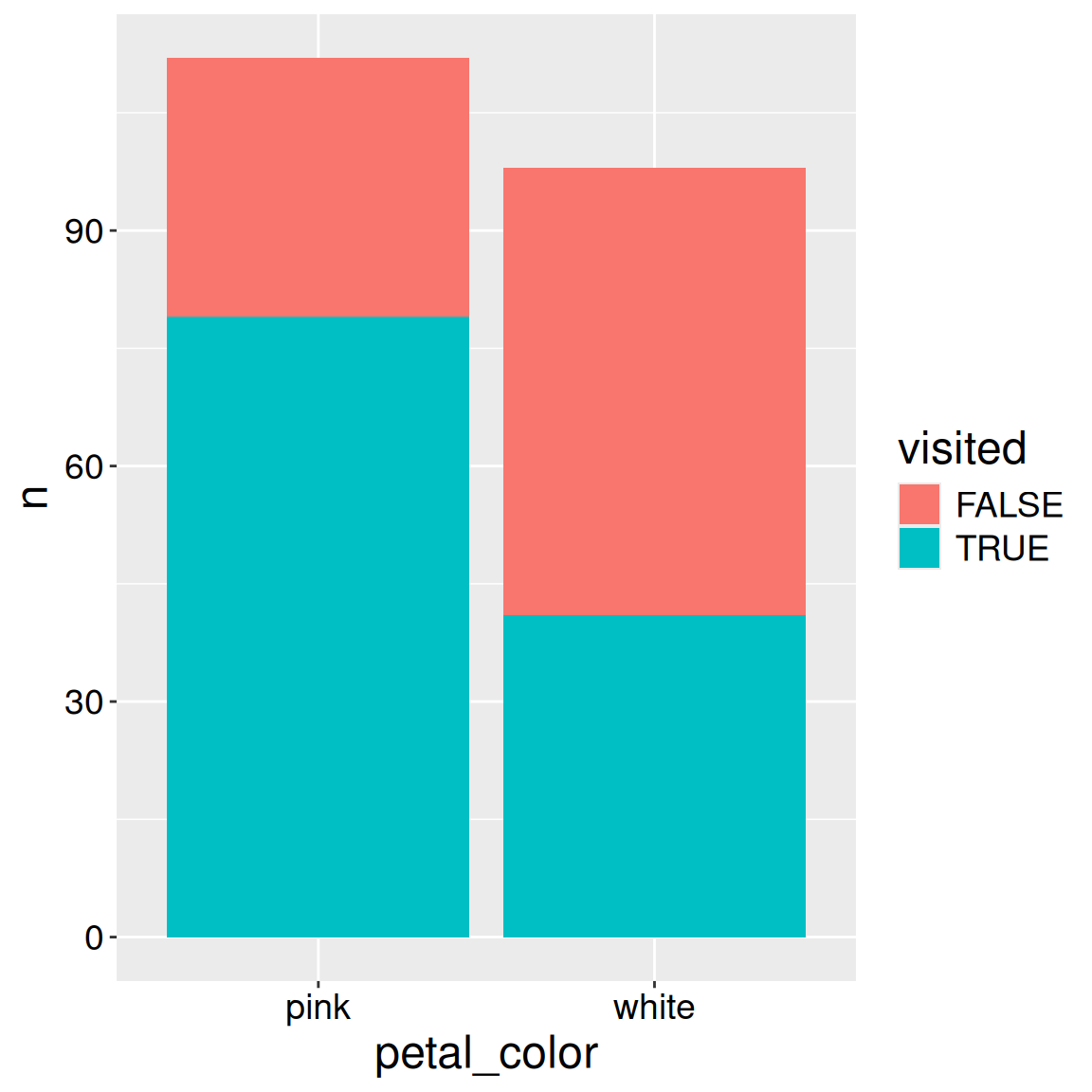 Note: Here we map petal color onto the x-axis, and visited (TRUE / FALSE) onto the fill aesthetic.