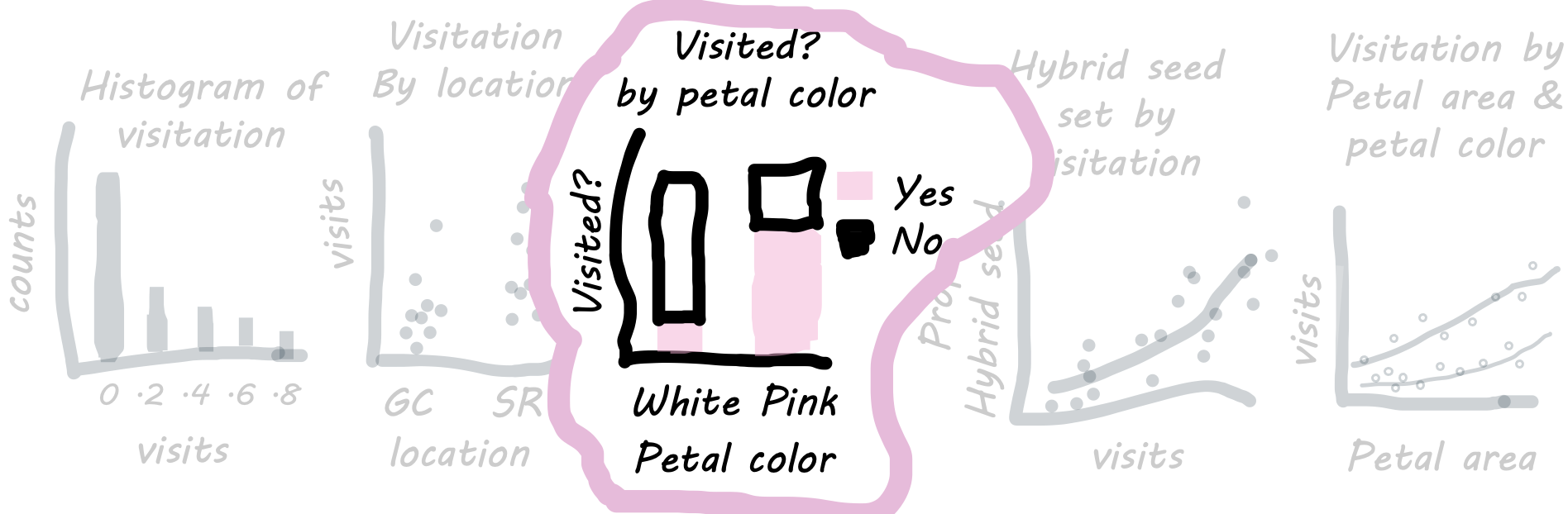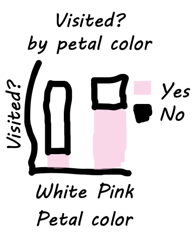 Interpretation: We see that a greater proportion of pink-flowered plants receive visits compared to white-flowered plants.