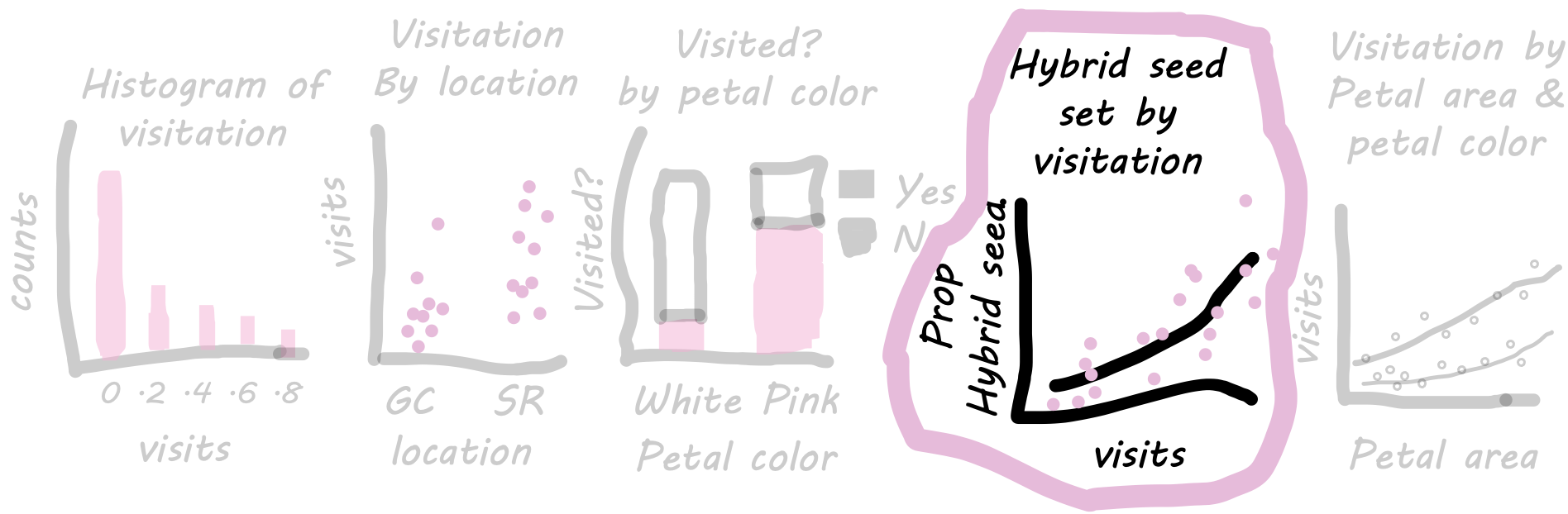 When Brooke watched pollinators visit parviflora recombinant inbred lines (RILs), she was hoping that these observations also informed the probability of hybrid seed set. The first step in evaluating this hypothesis is to generate a scatterplot – a visualization that shows the association between continuous variables.