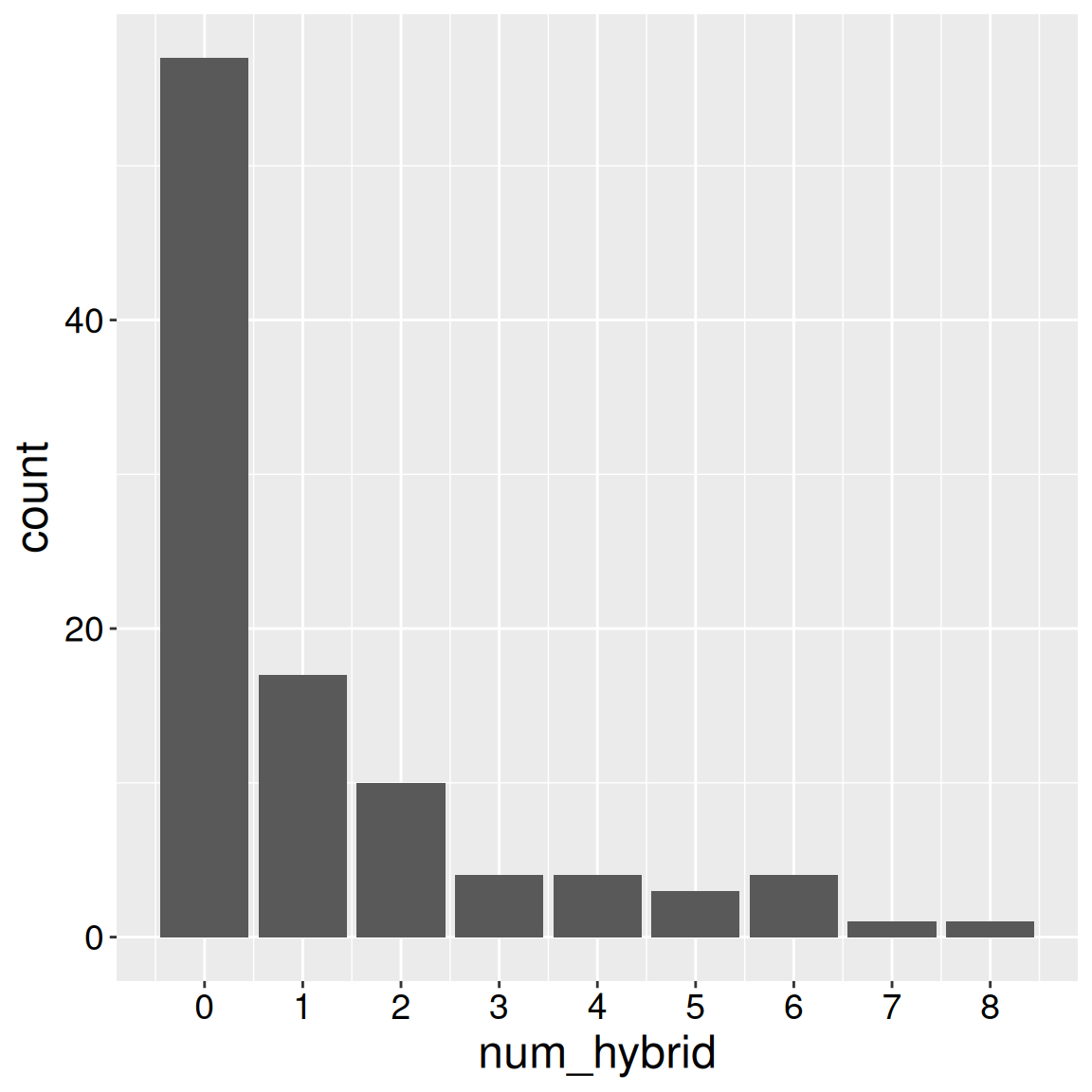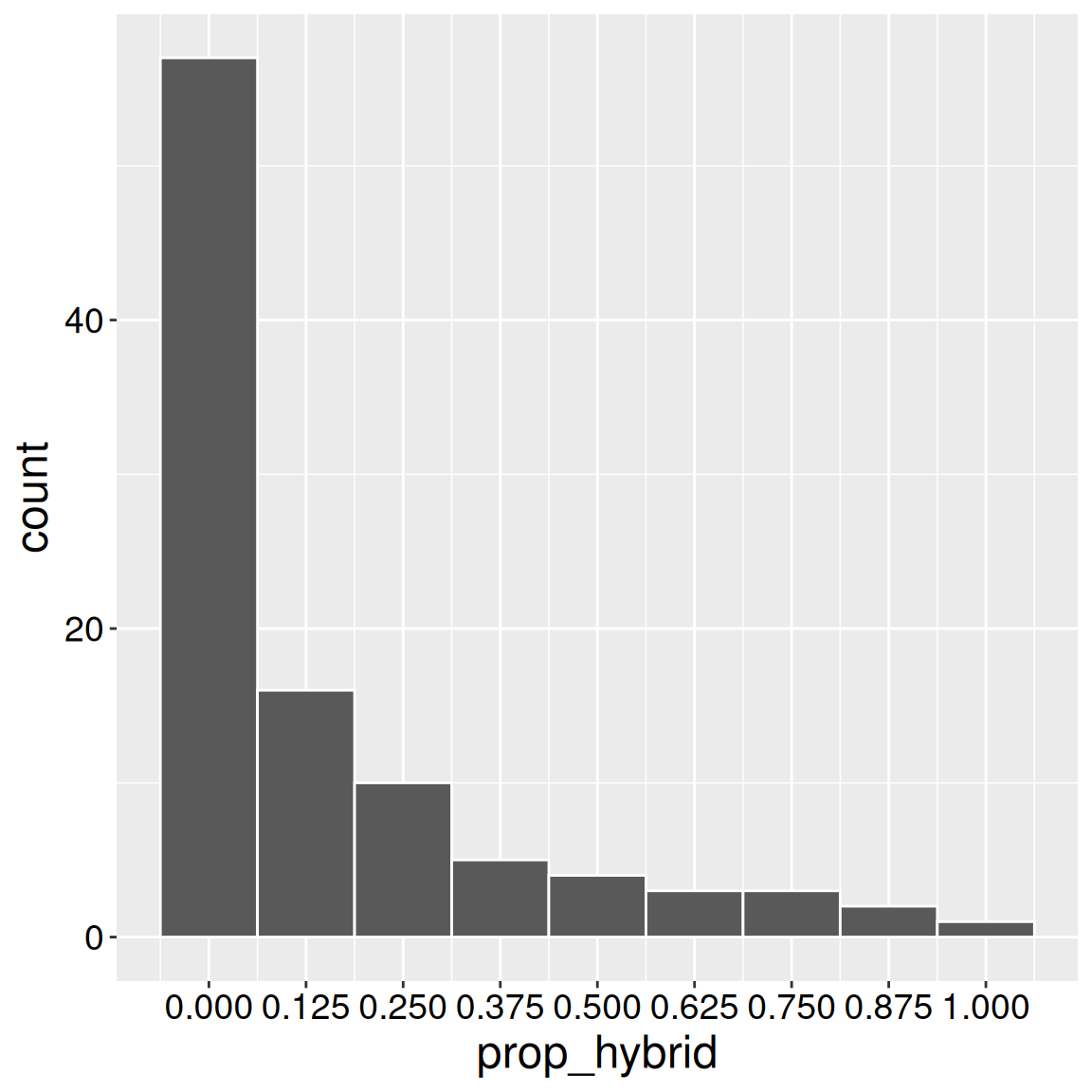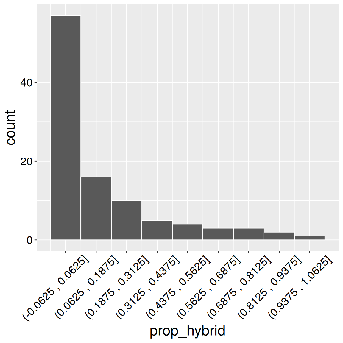We can similarly display discrete numerical variables as a bar plot. So, for example, the x-axis of Figure 2 (in the Num hybrid bar plot tab) shows the number of a mother’s seeds that we found to be hybrids, and the y-axis shows the number of mothers with x seeds shown to be hybrid.
